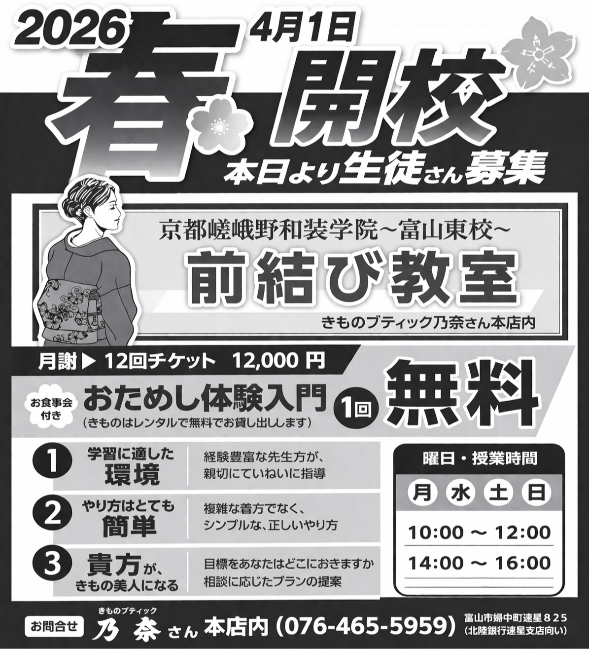 | 学校名 | 京都嵯峨野和装学院~富山東校~ きものブティック乃奈さん本店内 |